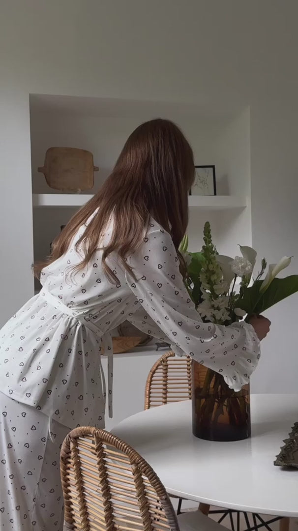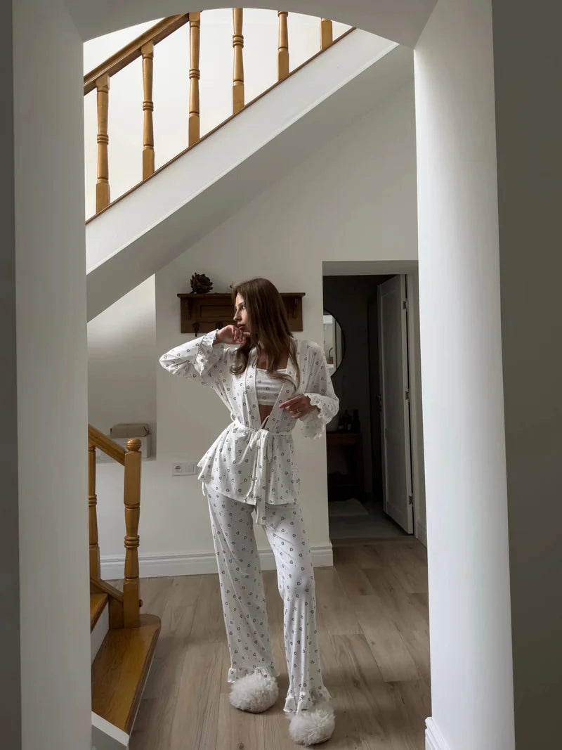 Lucinda to trzyczęściowy zestaw stworzony z myślą o kobietach, które kochają połączenie delikatności, komfortu i subtelnej elegancji. Miękka, przewiewna tkanina otula ciało w najbardziej przyjemny sposób, a uroczy wzór w serduszka dodaje całości lekkości i dziewczęcego wdzięku.