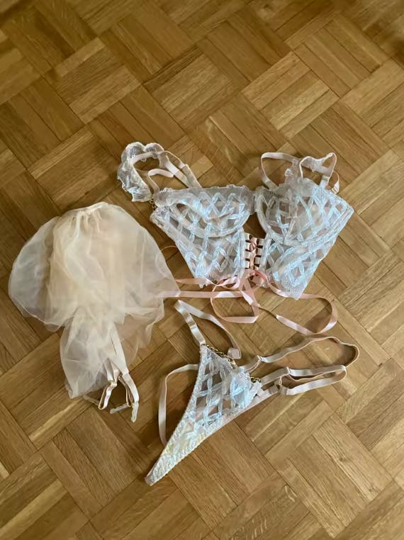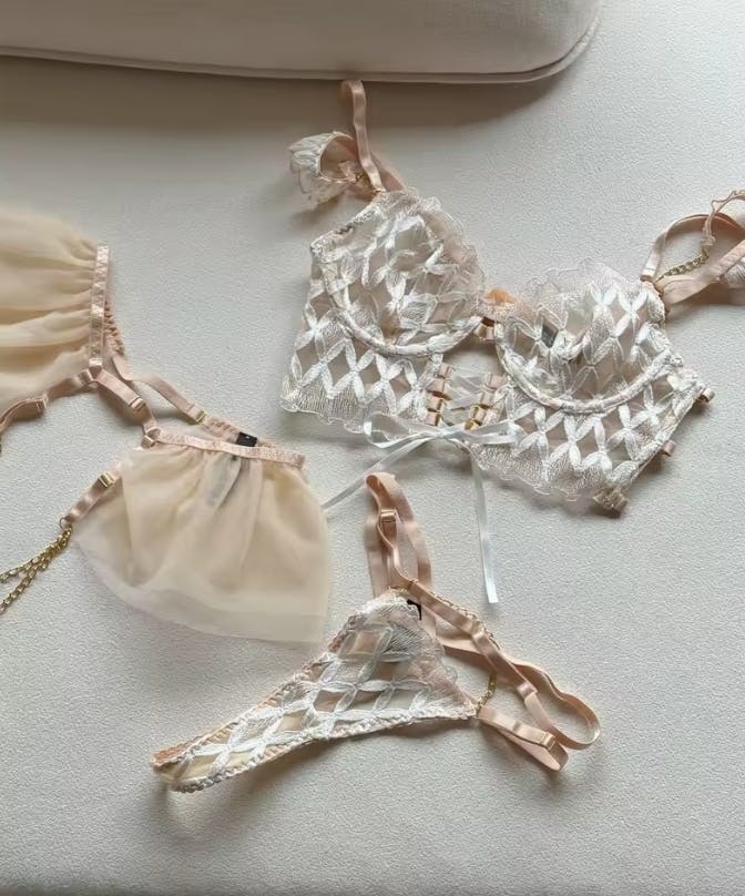 Odkryj zestaw Muse – wyjątkowy komplet bielizny, w którym fantazja spotyka się z elegancją. Inspirowany gorsetem projekt zachwyca misterną koronką, złotymi łańcuszkami i subtelnym tiulem, który lekko unosi się przy każdym ruchu. To model, który podkreśla kobiecą sylwetkę, uwodzi detalem i emanuje luksusem z każdej strony.