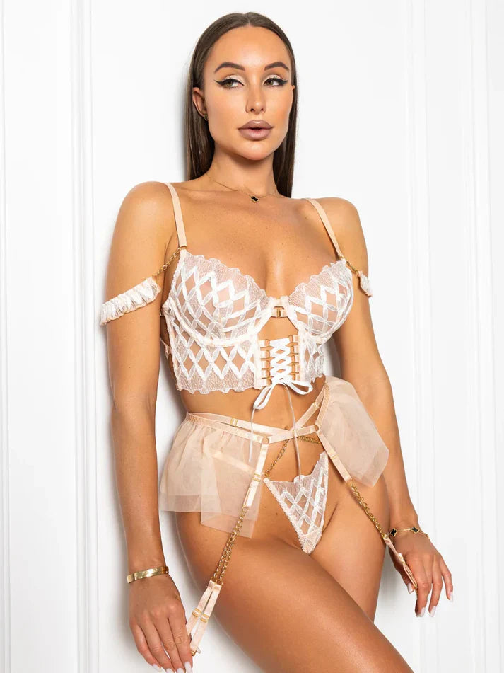 Gorsetowy biustonosz z fiszbinami i sznurowaniem z przodu zapewnia doskonałe podtrzymanie i zmysłowe dopasowanie. Odczepiane ramiączka z delikatnymi łańcuszkami w złotym odcieniu dodają całości wyrafinowanego charakteru, a tiulowy pas do pończoch z falbaną nadaje lekkości i wdzięku. Całość uzupełniają dopasowane stringi z subtelnymi wycięciami.