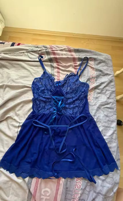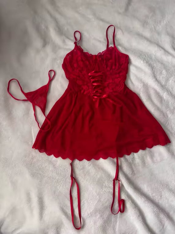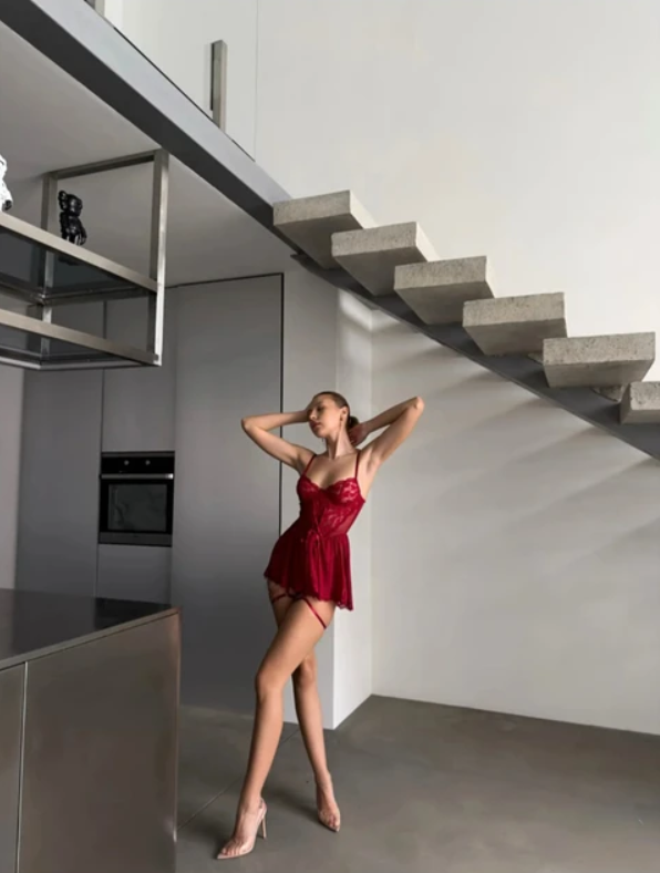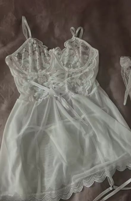 Z przodu uwagę przyciąga wiązanie w stylu gorsetowym, dodające charakteru i efektu „węższej talii”, a dołączone paski do pończoch oraz stringi tworzą kompletny, idealnie skomponowany look.