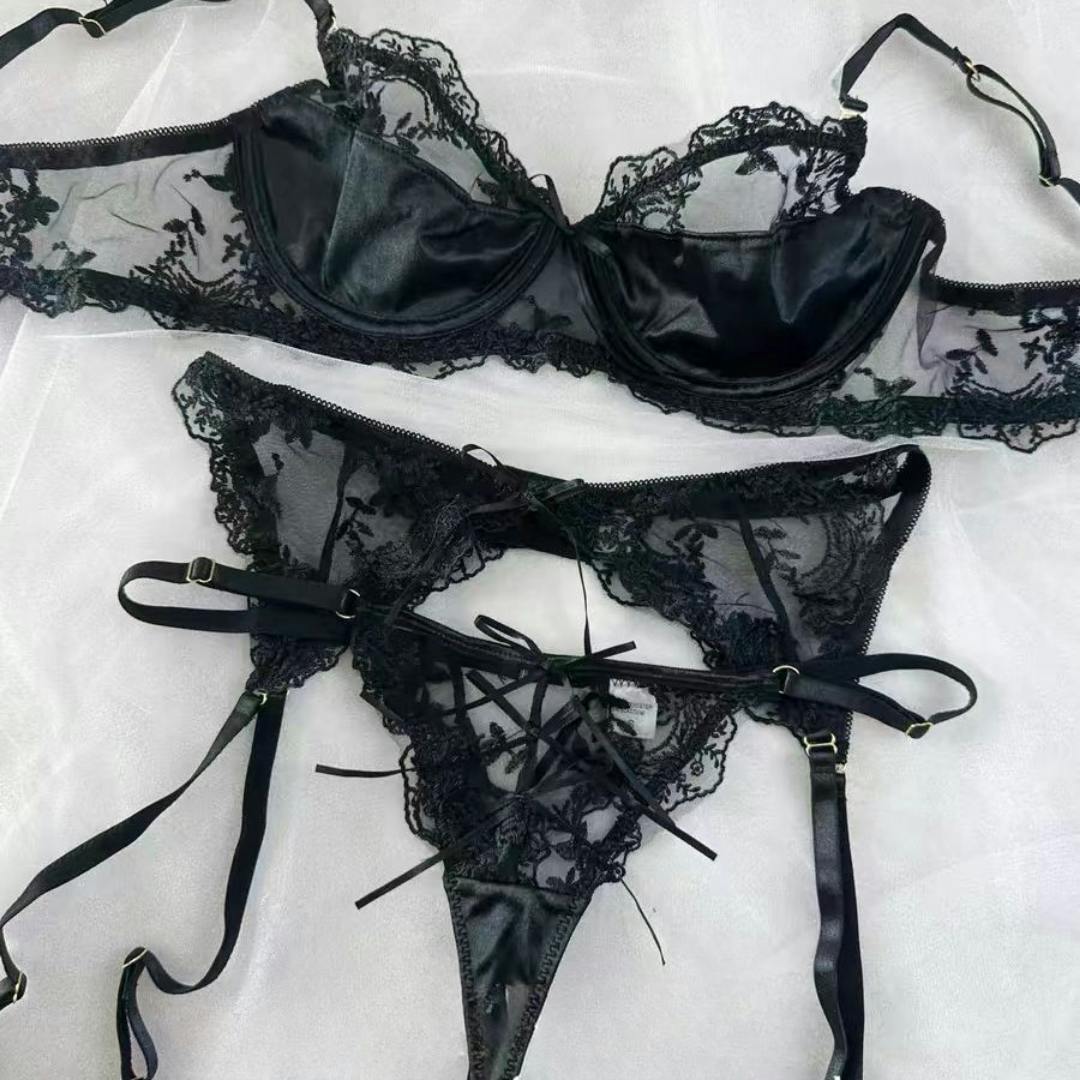 Ismene to niezwykle elegancki, trzyczęściowy zestaw bielizny, który łączy transparentną siateczkę z misternym haftem kwiatowym i satynowymi wykończeniami, tworząc zmysłowy, a jednocześnie wyrafinowany efekt. Biustonosz typu longline na fiszbinach subtelnie unosi i modeluje biust, nadając mu piękny, naturalny kształt, a delikatne kokardki dodają całości romantycznego charakteru. Regulowane ramiączka pozwalają idealnie dopasować zestaw do sylwetki.