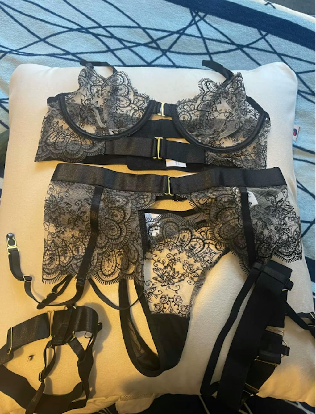 Regulowany pas do pończoch z podwiązkami dopełnia zestaw, tworząc spójną i niezwykle kobiecą całość. Złote detale dodają elegancji i luksusowego wykończenia, a dopracowana konstrukcja zapewnia komfort noszenia i idealne dopasowanie do sylwetki.