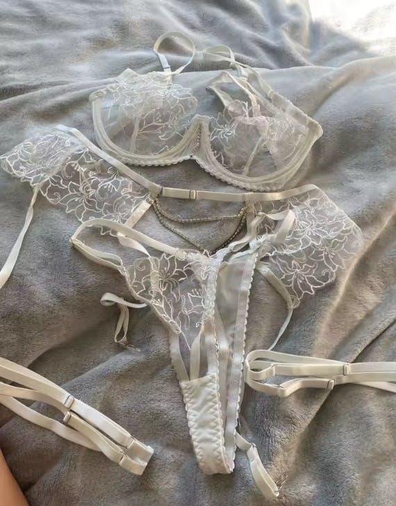 Biustonosz na fiszbinach delikatnie unosi biust, podkreślając jego naturalny kształt, a regulowane ramiączka pozwalają idealnie dopasować całość do sylwetki. Transparentne tkaniny subtelnie odkrywają skórę, zachowując przy tym lekkość i klasę. Dopasowane stringi oraz pas do pończoch tworzą spójną, uwodzicielską całość.